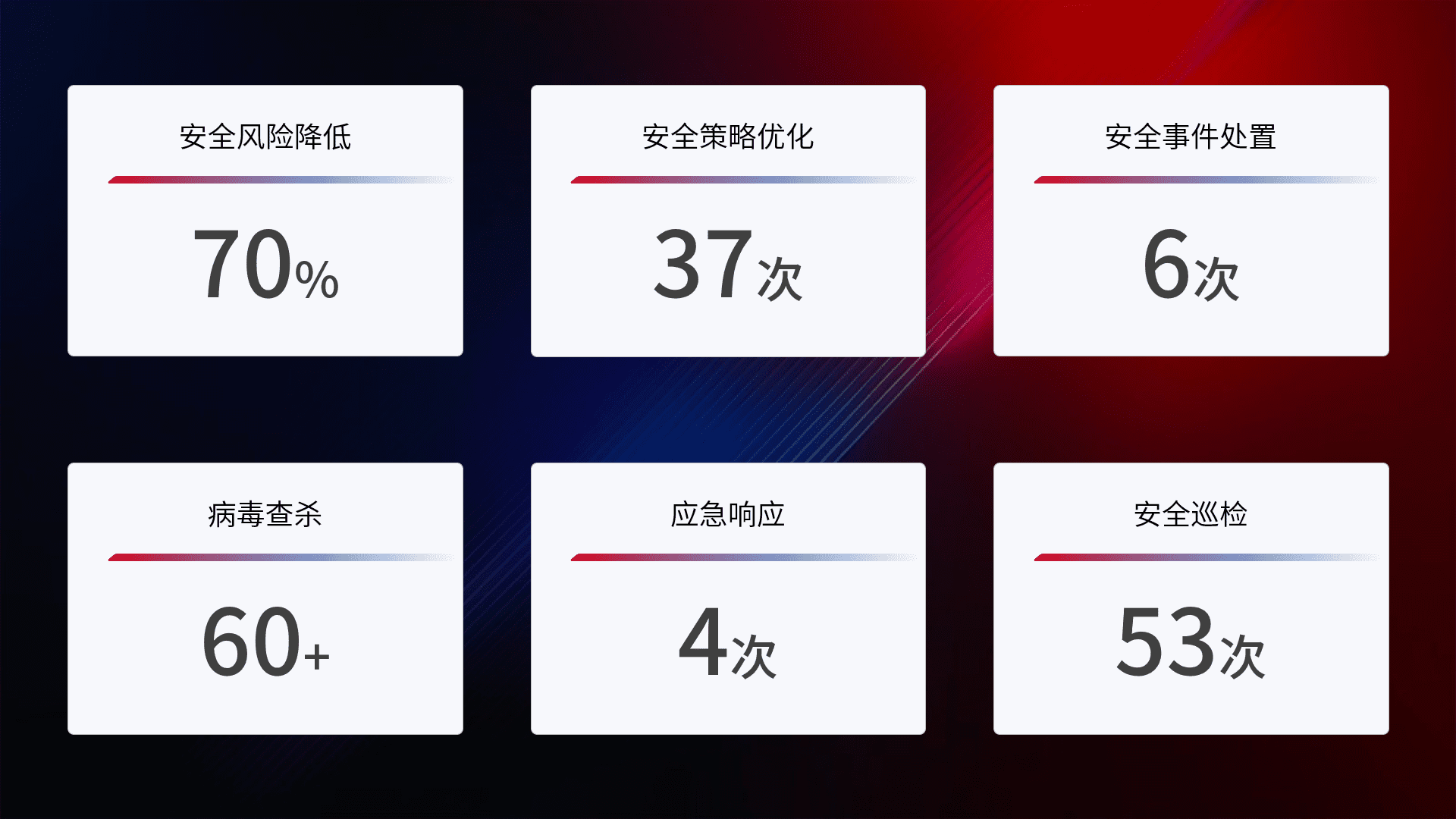 提供全面的安全事件报告体系,,包括处置报告、、周报、、、、季度和年度总结,,,结合持续监控,,帮助客户深入了解网络安全状况。。