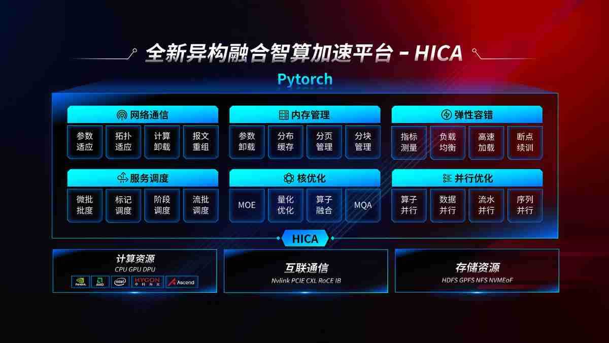 通过自研的服务层、、、、中间适配层、、、以及调度编排算法,,采用数据并行、、、模型并行等多种并行方式,,,把并行计算任务进行有效的分解,,使其分别由相应的软件栈和算力资源来承接。。当GPU资源变化,,,,HICA可以实时动态调度计算子任务并调整模型拓扑和架构,,,以充分聚合各种算力资源。。